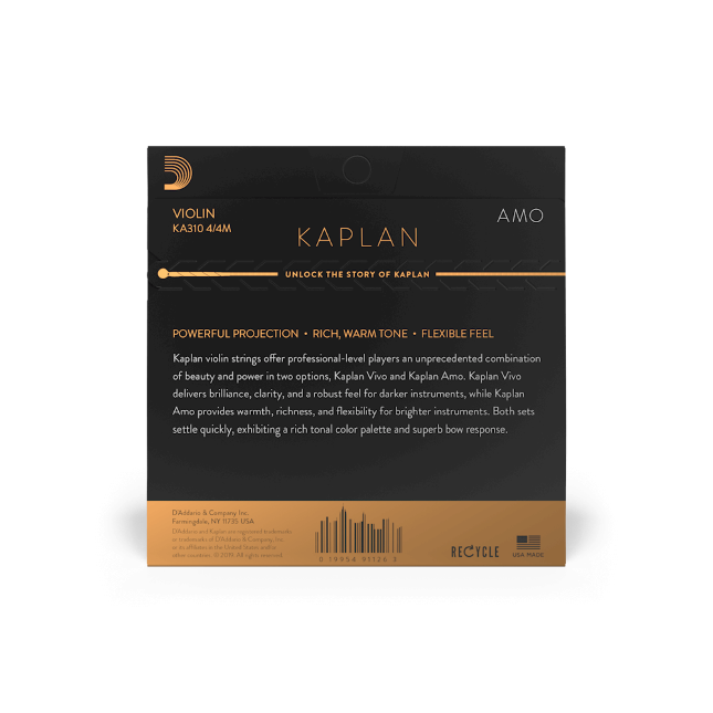 D'Addario Kaplan Amo to profesjonalne struny zaprojektowane dla zaawansowanych skrzypków. Oferują ciepłe, wyraziste brzmienie i elastyczną odpowiedź, szczególnie dobrze współpracując z jaśniej brzmiącymi instrumentami. Rozmiar 4/4 z naciągiem Medium to najpopularniejszy wybór wśród profesjonalistów.