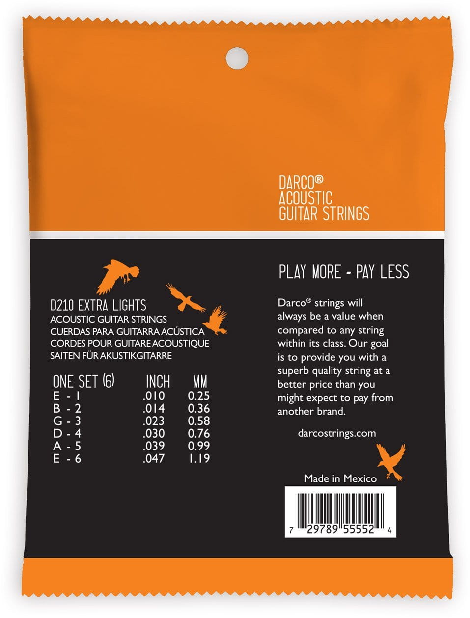 Struny Darco D210 Extra Light to ekonomiczne rozwiązanie dla gitarzystów akustycznych poszukujących lekkiego naciągu i przystępnej ceny. Wykonane z fosforobrązu 92/8 (92% miedzi, 8% cyny), oferują standardowe brzmienie akustyczne w rozmiarze Extra Light (10-47).