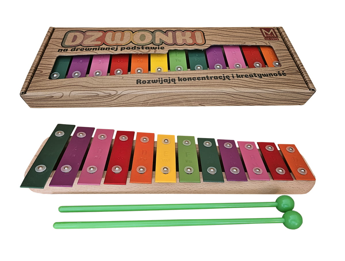 Oznaczenie „KD” to gwarancja, że płytki są osadzone na pełnej, drewnianej podstawie. W świecie dzwonków edukacyjnych materiał ma ogromne znaczenie. Drewno sprawia, że dźwięk nie „dzwoni” w uszach w nieprzyjemny sposób, ale jest ciepły i selektywny. Solidna konstrukcja ramy zapewnia też stabilność – instrument nie przesuwa się na stole podczas energicznego uderzania pałeczkami, co często zdarza się w lekkich, plastikowych wersjach.