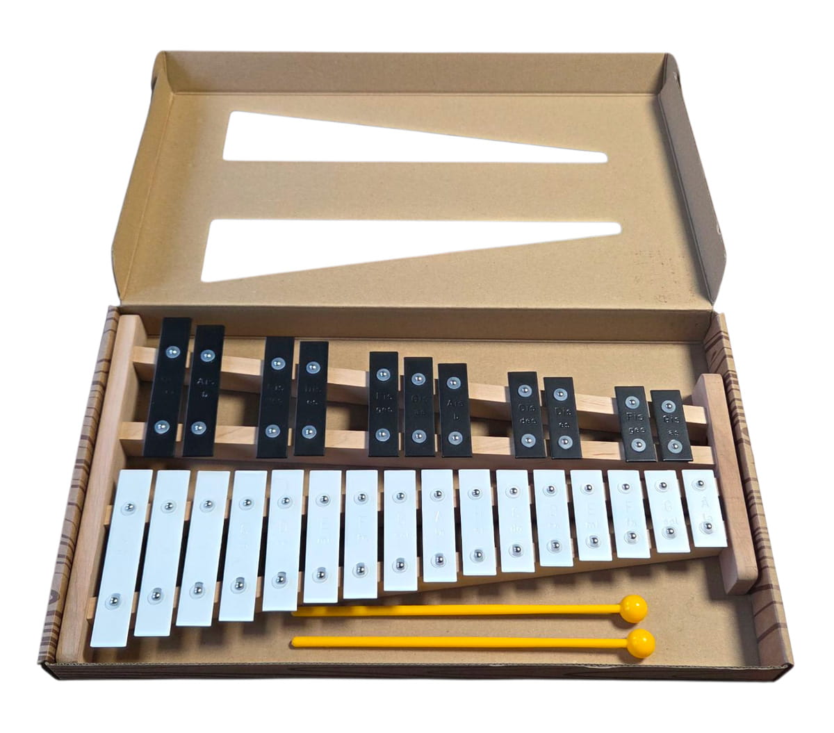W przeciwieństwie do modeli diatonicznych, model M05D posiada dwa rzędy sztabek. Dolny rząd to dźwięki podstawowe, natomiast górny (czarny) odpowiada za półtony. Taka konstrukcja sprawia, że instrument jest w pełni uniwersalny – pozwala na grę w każdej tonacji i wykonywanie skomplikowanych melodii klasycznych czy rozrywkowych. Czarno-biała kolorystyka sztabek ułatwia naukę i pozwala na intuicyjne przeniesienie wiedzy teoretycznej na inne instrumenty klawiszowe, takie jak pianino czy akordeon.