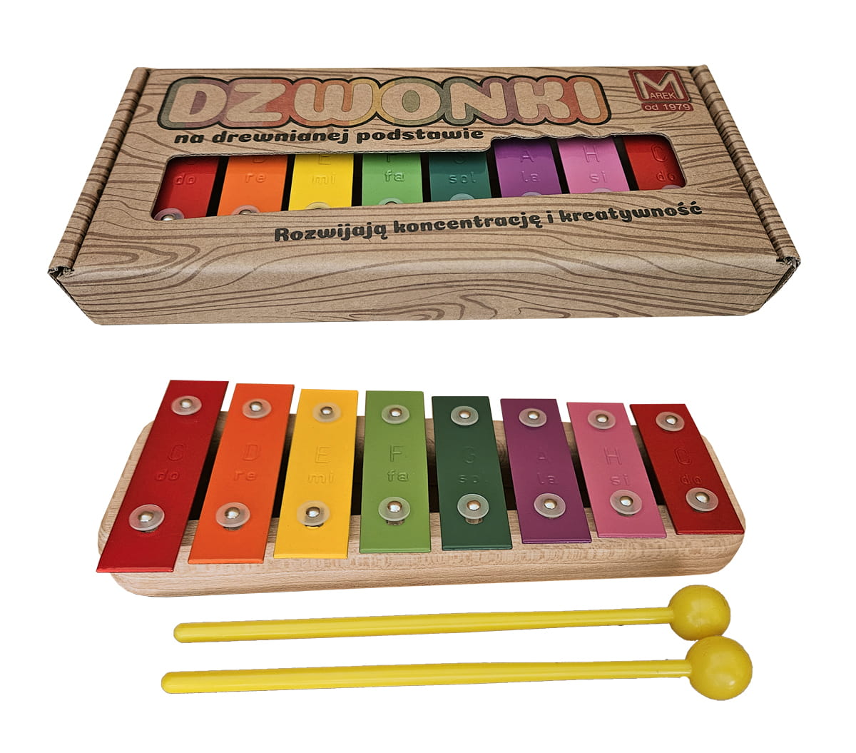 Model MK59KD to „starszy brat” wersji 5-tonowej i jeden z najczęściej wybieranych instrumentów do edukacji muzycznej w Polsce. Dzięki ośmiu nastrojonym płytkom, dziecko otrzymuje dostęp do pełnej skali diatonicznej (od C do C). To moment, w którym zabawa rytmem zamienia się w prawdziwe muzykowanie – na tym instrumencie można zagrać niemal każdą popularną piosenkę dziecięcą, od „Wlazł kotek na płotek” po kolędy.
