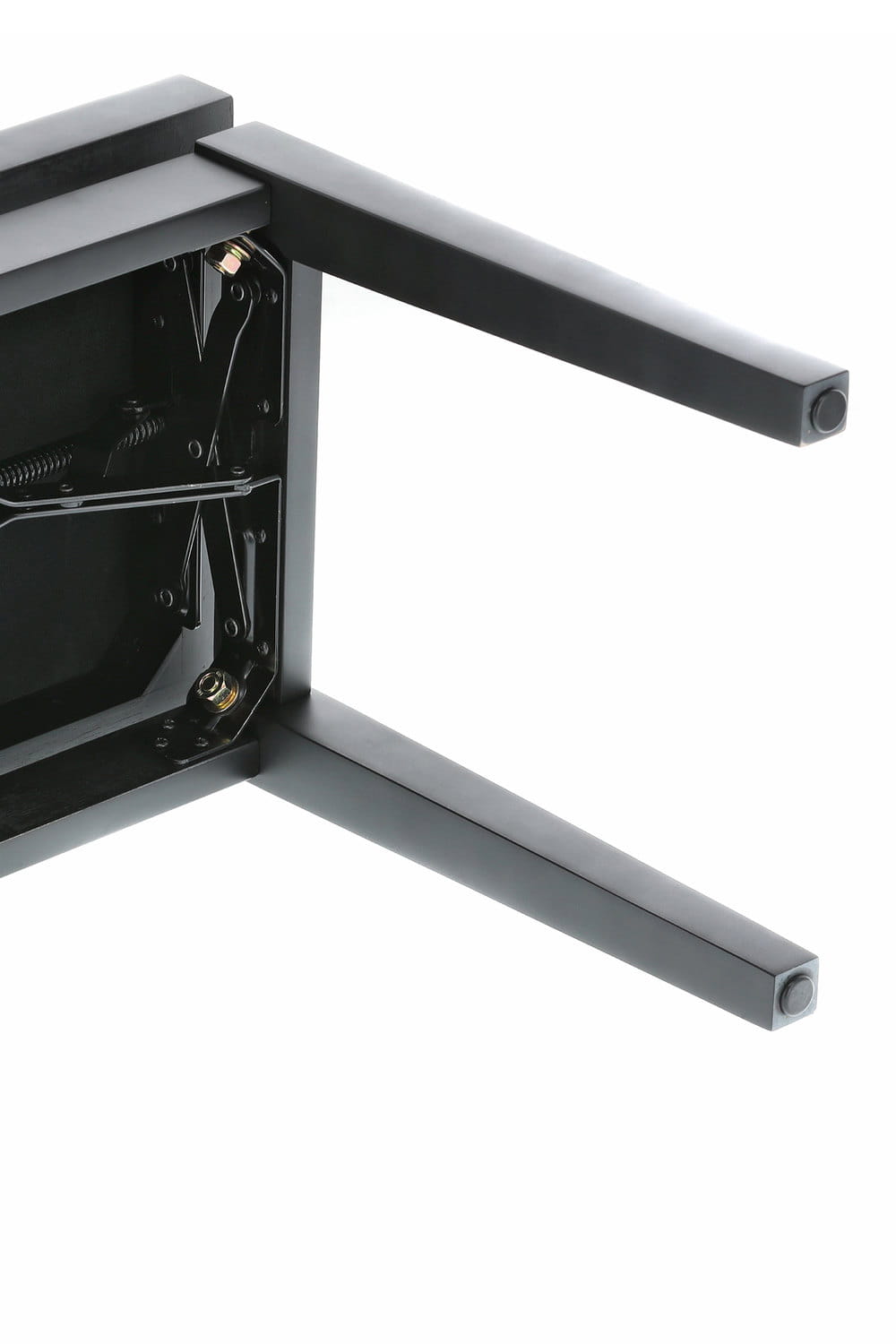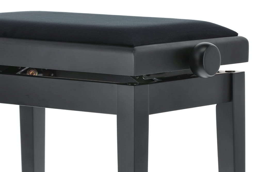 Powierzchnia siedziska o wymiarach 52x30 cm pokryta jest wysokiej jakości czarnym welurem, który zapewnia komfort nawet podczas wielogodzinnych sesji ćwiczeniowych. Eleganckie czarne wykończenie krzesełka harmonijnie komponuje się z każdym instrumentem, szczególnie z czarnymi fortepianami i pianinami.
