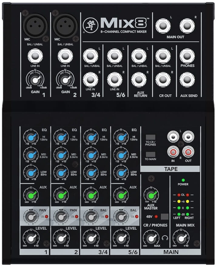 8 kanałowy kompaktowy mikser audio, 2 wejścia mikrofonowo liniowe, kontrola Panoramy, kontrola poziomu sygnału, zasilanie Phantom, 2 wejścia stereo 1/4", 3 pasmowy EQ, 1 wysyłka aux z powrotem stereo 1/4'’, Wejscie/wyjście stereo RCA dla polaybacku i nagrywania, wyjście główne L/R , Wyjście słuchawkowe i Control, Wymiary: 53 x 198 x 244 mm, Masa 0,6 kg