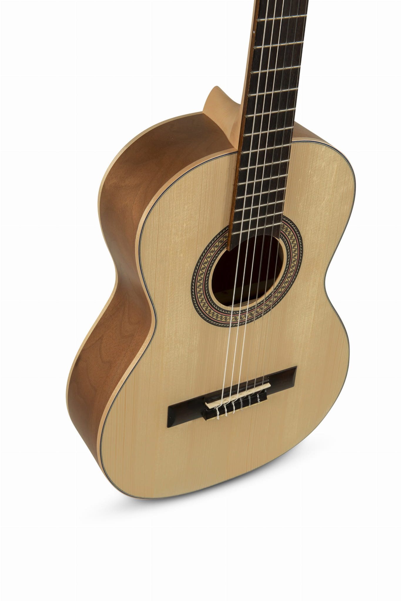 Podstawą dobrego brzmienia gitary jest jej płyta wierzchnia. W modelu E-57 zastosowano lity świerk europejski, który charakteryzuje się jasnym, klarownym i selektywnym dźwiękiem. Taka charakterystyka tonalna jest niezwykle pomocna w procesie nauki – każdy zagrany przez dziecko dźwięk jest wyraźny i czytelny, co ułatwia pracę nad poprawną artykulacją i intonacją. Lity top, w przeciwieństwie do laminowanego, rezonuje znacznie swobodniej, oferując głośniejszy i bogatszy dźwięk, który motywuje do codziennych ćwiczeń.